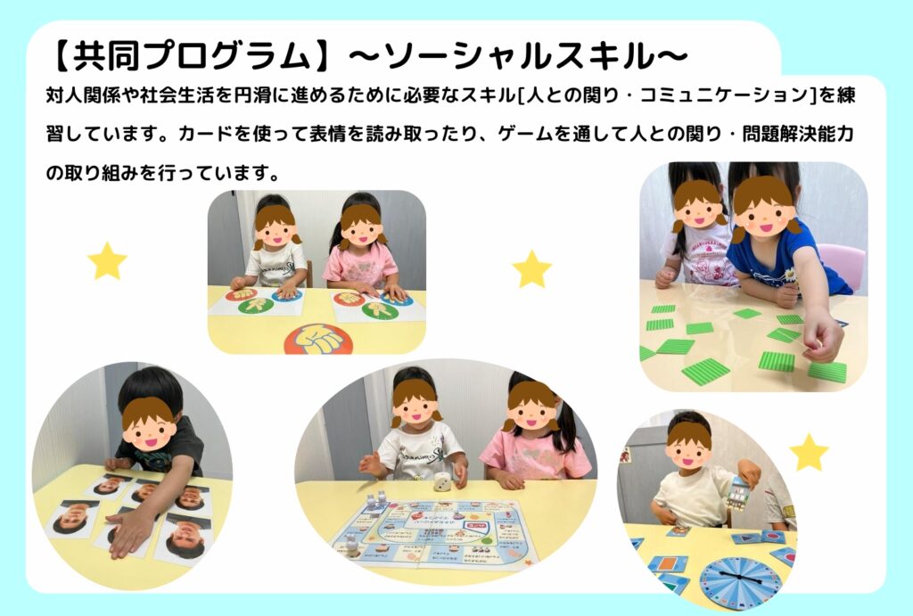 お友達と距離感やカードを使って表情を読み取ったり、ゲームを通してお友達との関り・問題解決能力の取り組みを行っています。