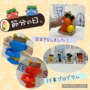 2月前半の週に豆まきの行事プログラムを行いました。 鬼の的当てや豆に見立てたボールを鬼の人形に向かって投げる粗大運動を行いました。 指導員と一緒に「鬼は外、福は内」と声を出しながら一生懸命に取り組んでくれました。中には的 […]
