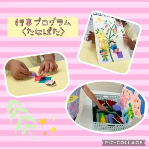 七夕にちなんだ行事プログラムを行いました。 製作では、スズランテープを割いて吹き流しを作ったり、正方形の色紙を使って見本を見ながら菱飾りを完成させる活動を行いました。 短冊には、クレヨンや色鉛筆を使って、お願い事や好きな […]