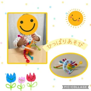 知育玩具を使って微細プログラムを行いました。 このプログラムでは、紐を掴んで引っ張る握力を鍛える効果や、引っ張った紐が出てくる所を見る中で手と目の協調運動の発達が期待されます。 シリコン素材の紐を引っ張ると「ガラガラガラ […]