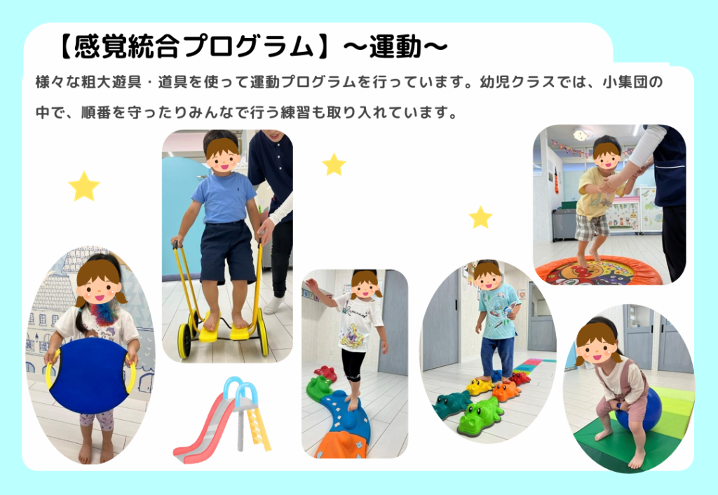 様々な粗大遊具・道具を使って運動プログラムを行っています。幼児クラスでは、小集団の中で、順番を守ったりみんなで行う練習も取り入れています。